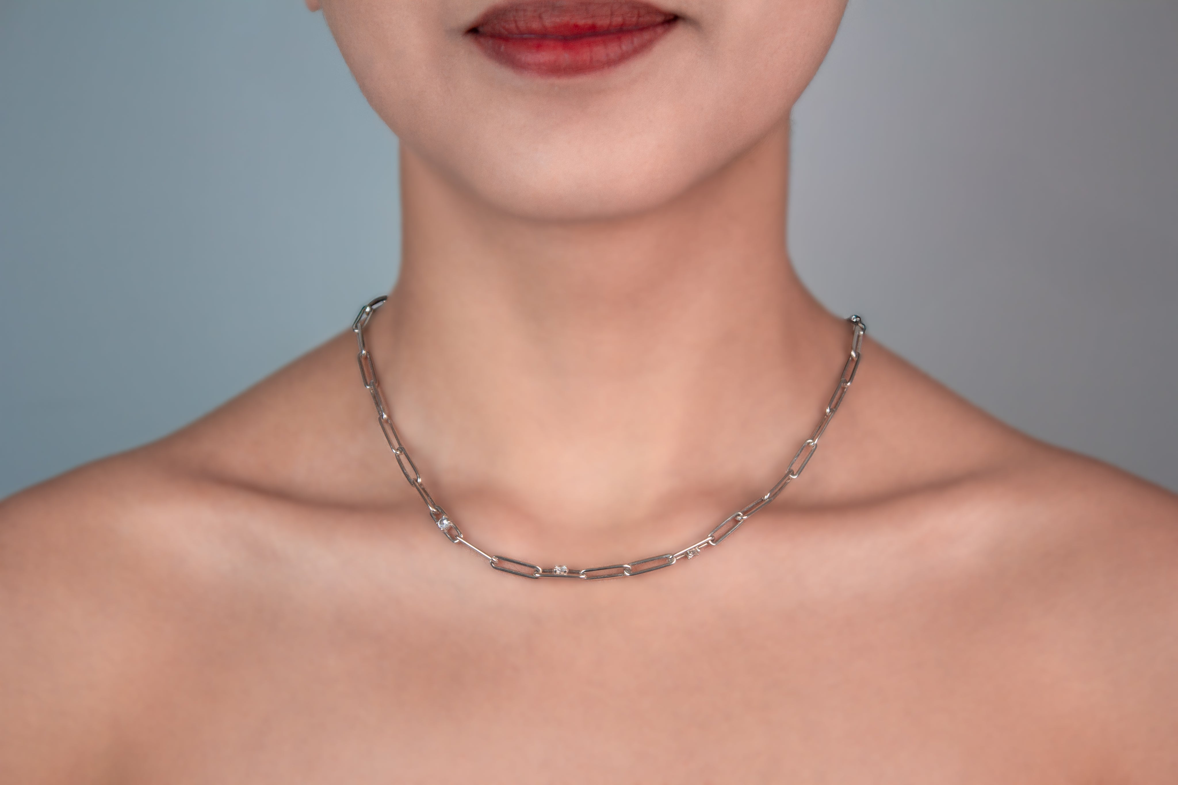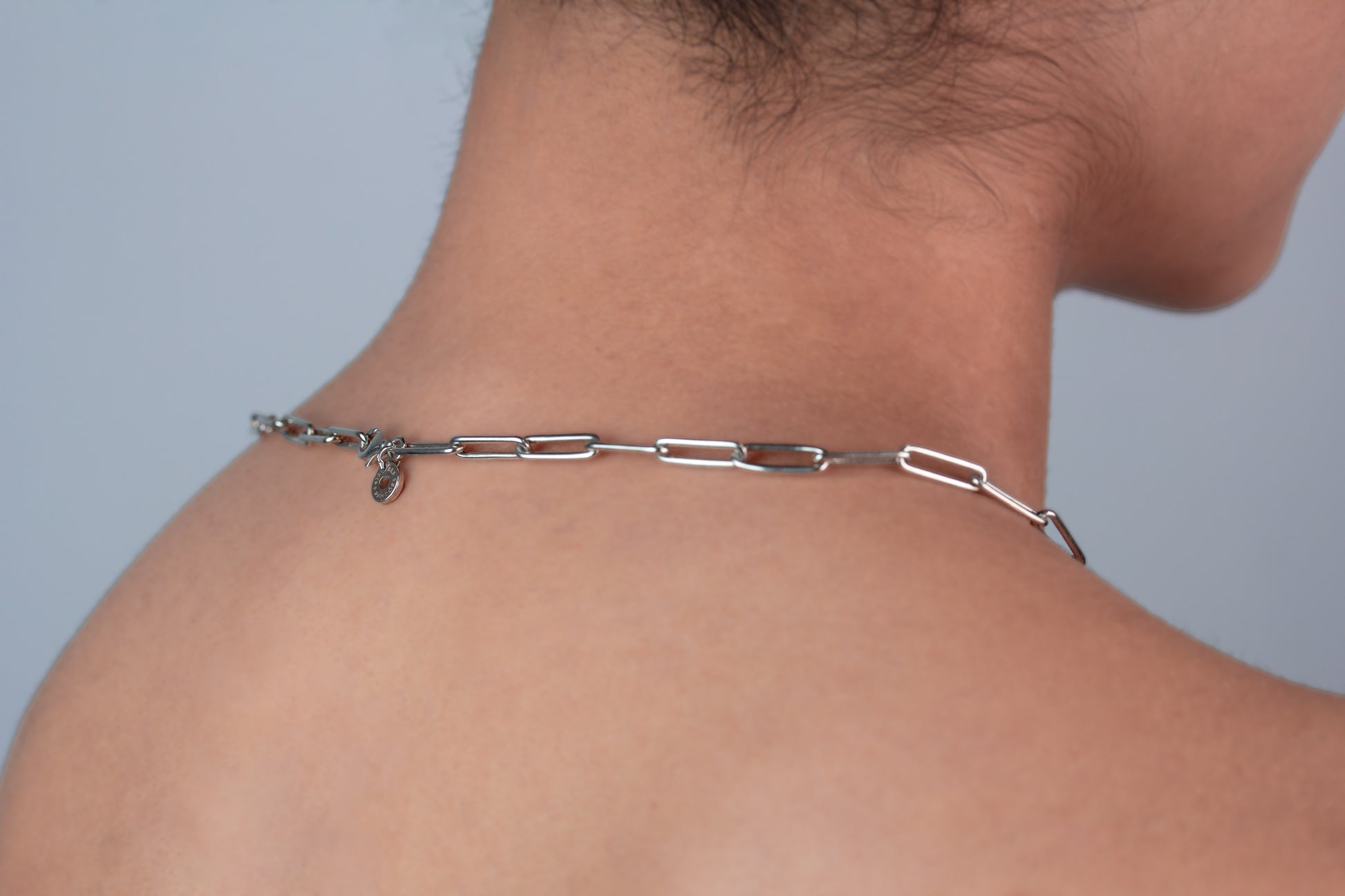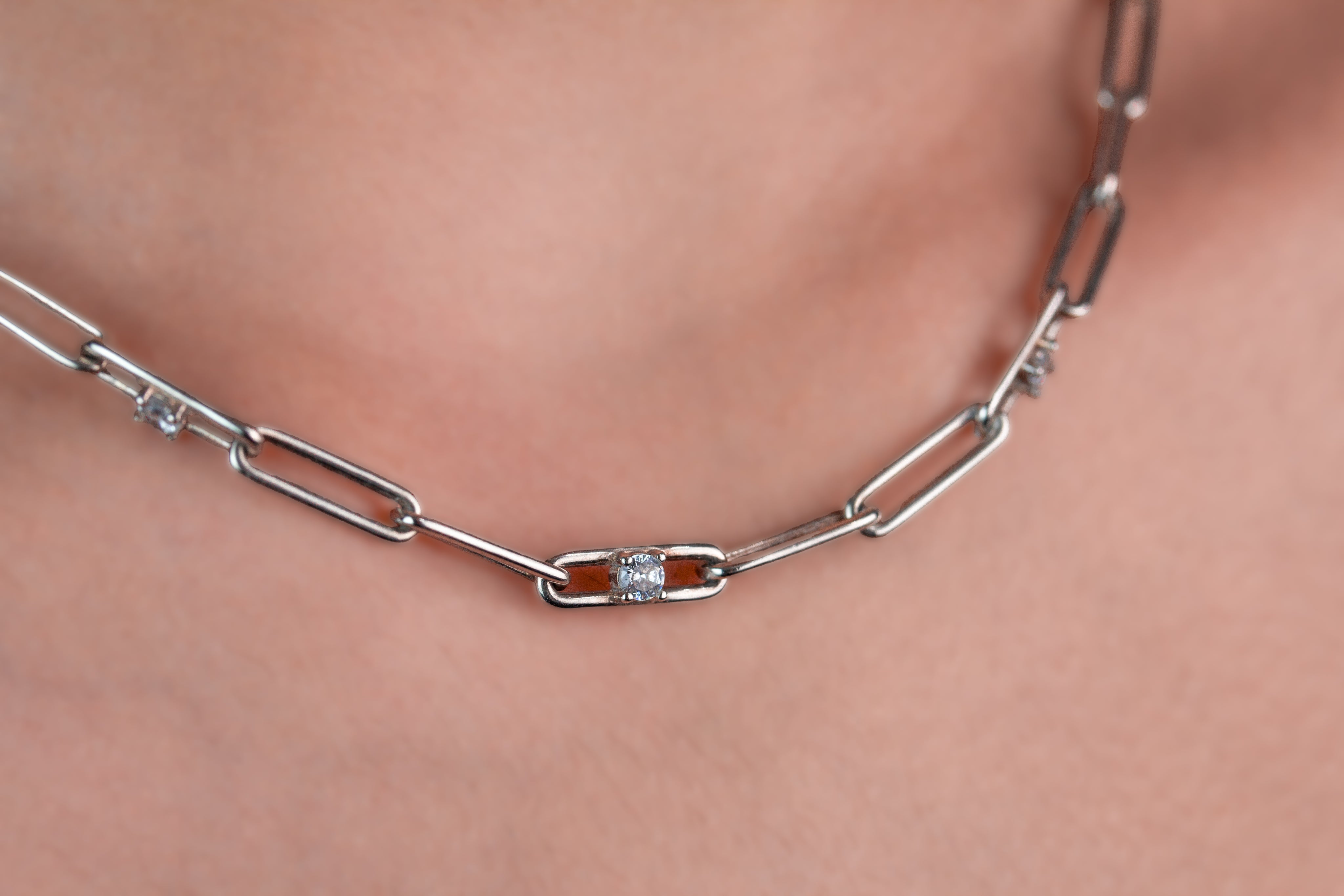 Collar de plata italiana 925 rodinada eslabones entrelazados y piedras semi preciosas de color blanco incrustadas.