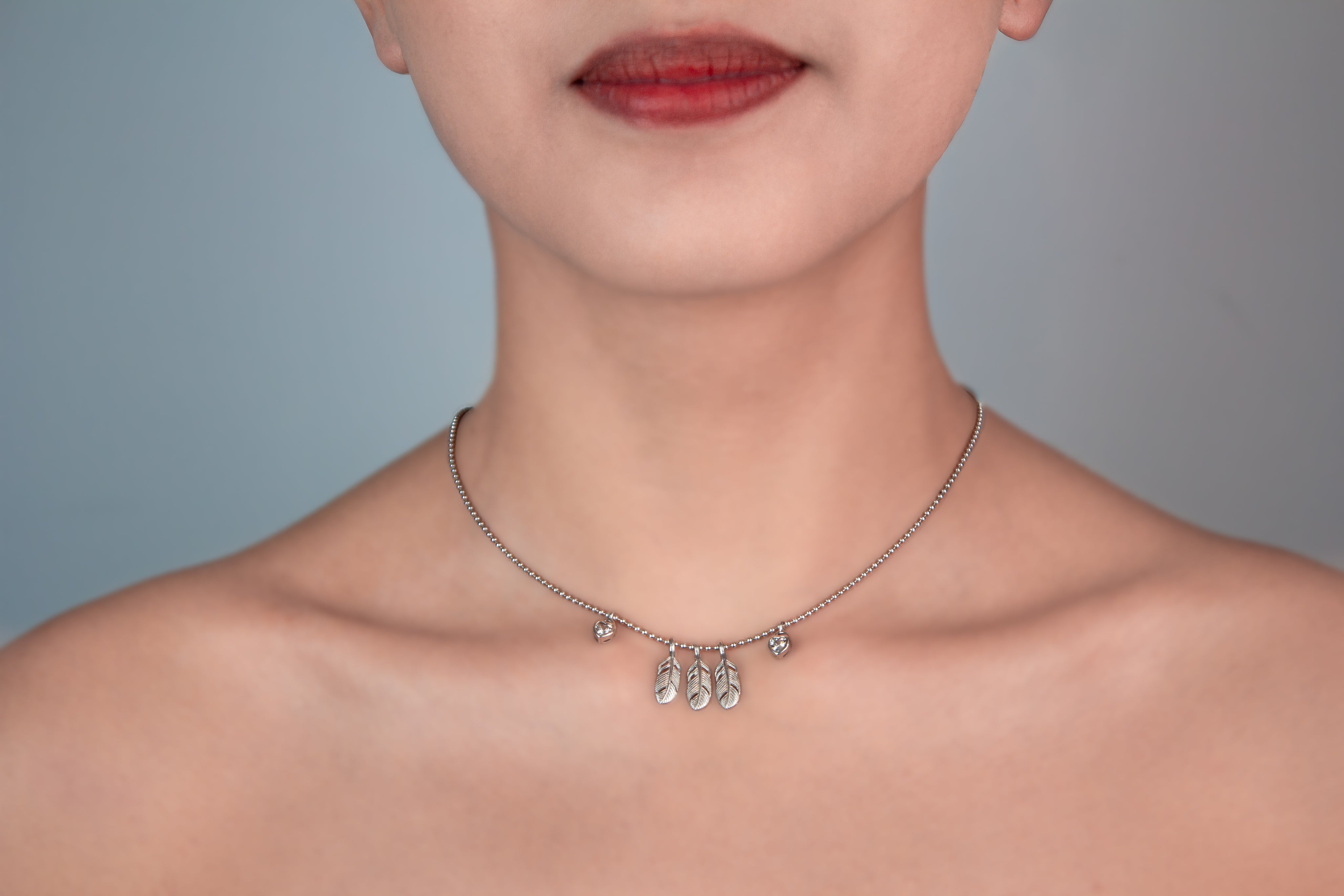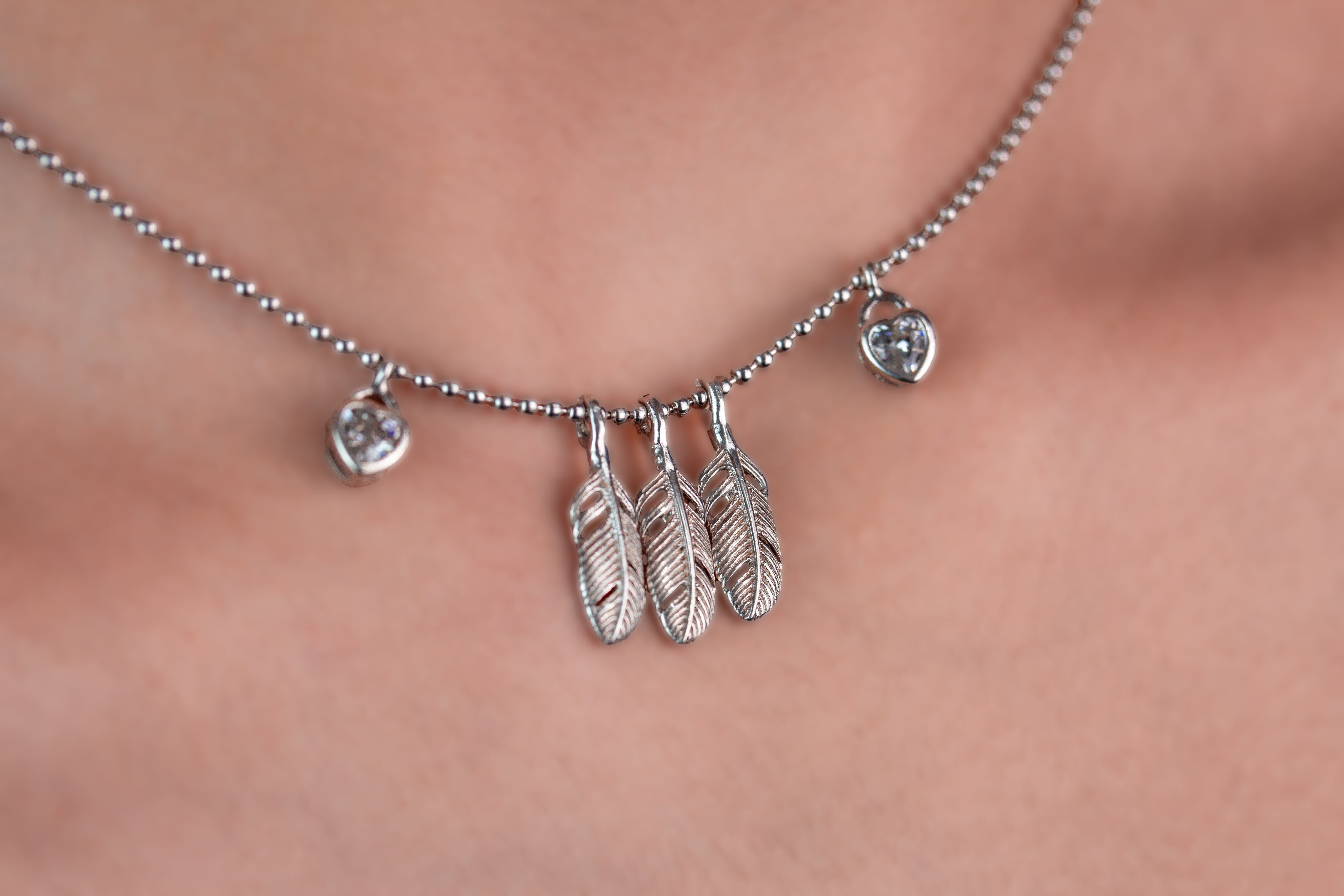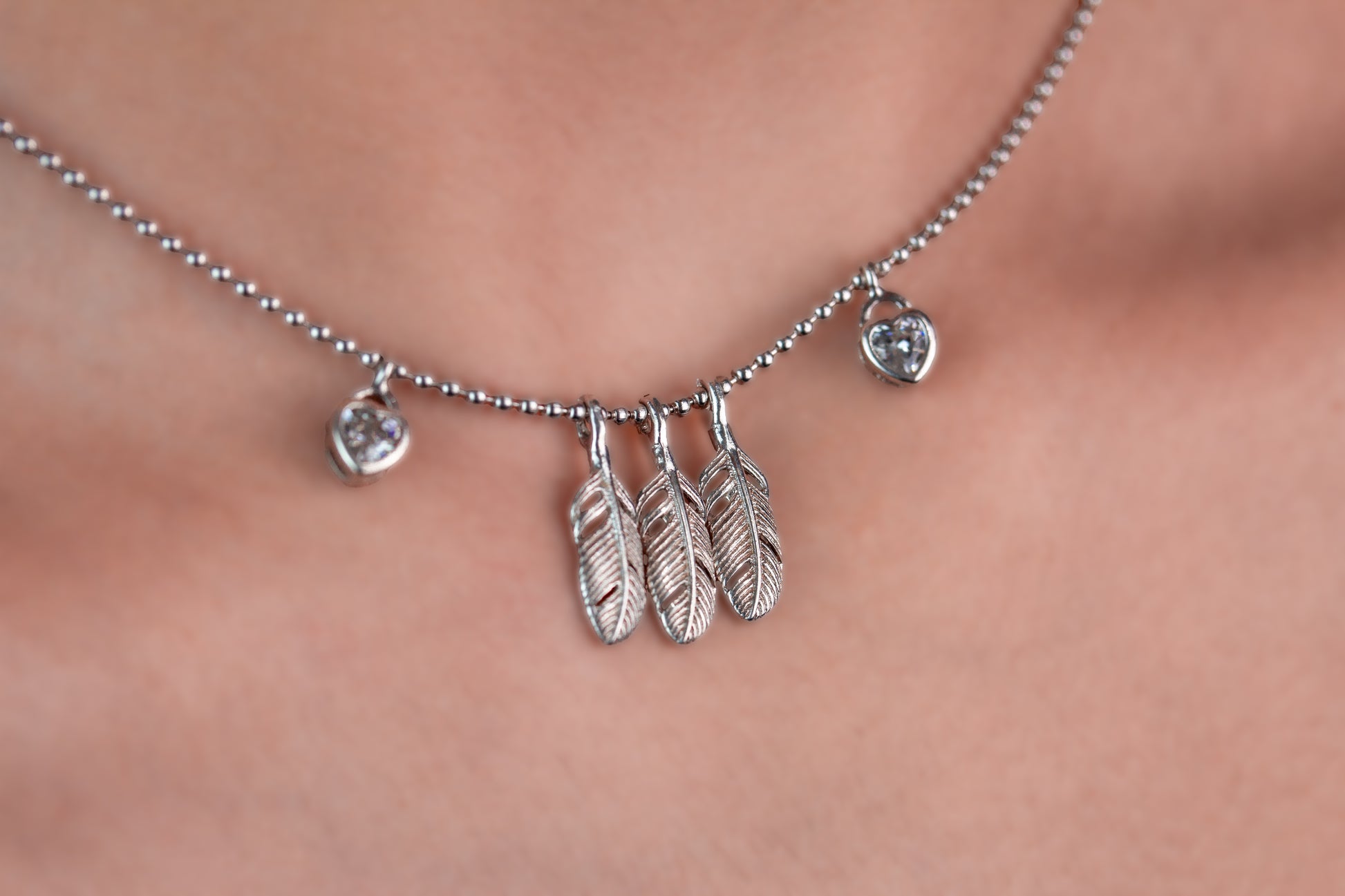 Gargantilla de plata italiana 925 con dijes de plumas y circonias en forma de corazón.