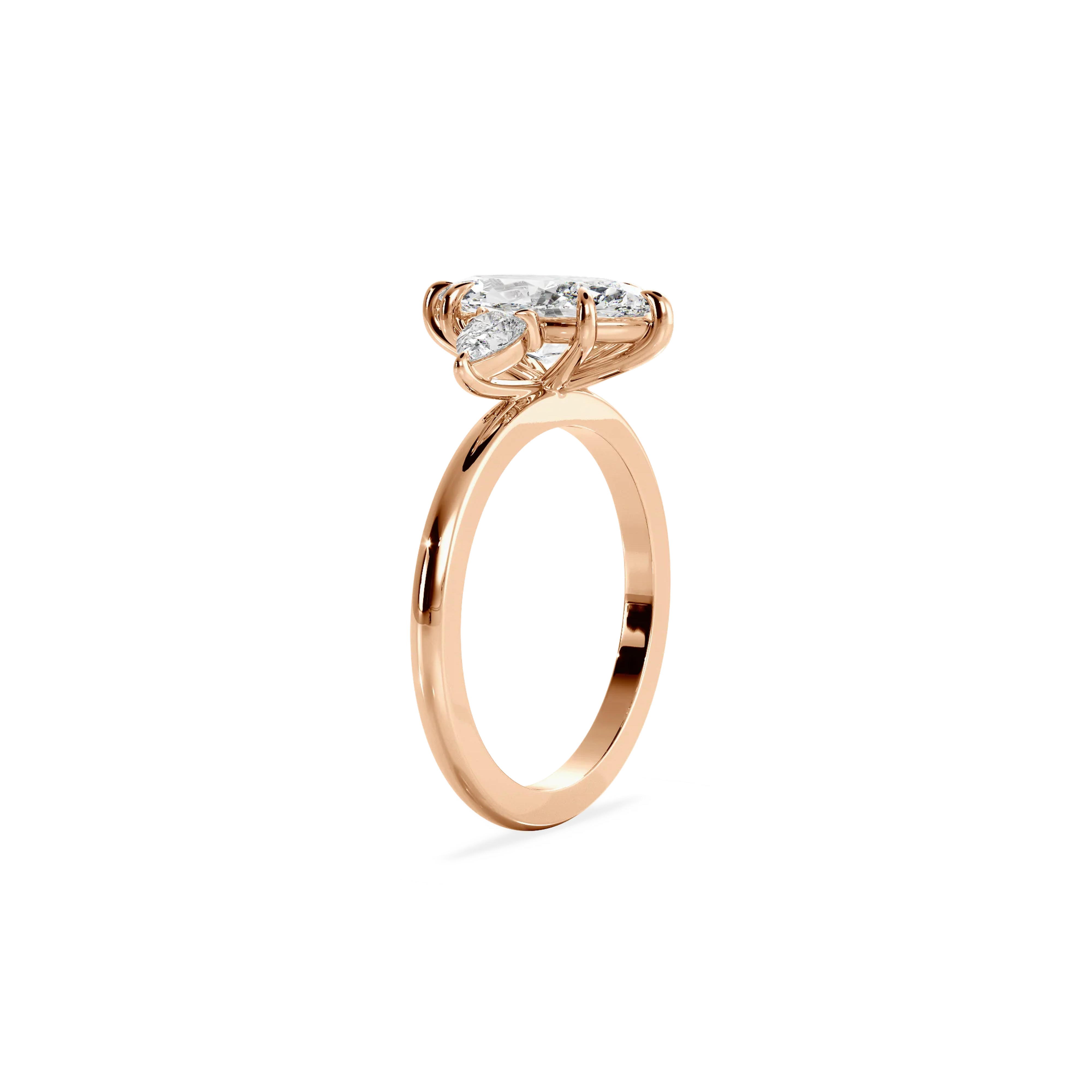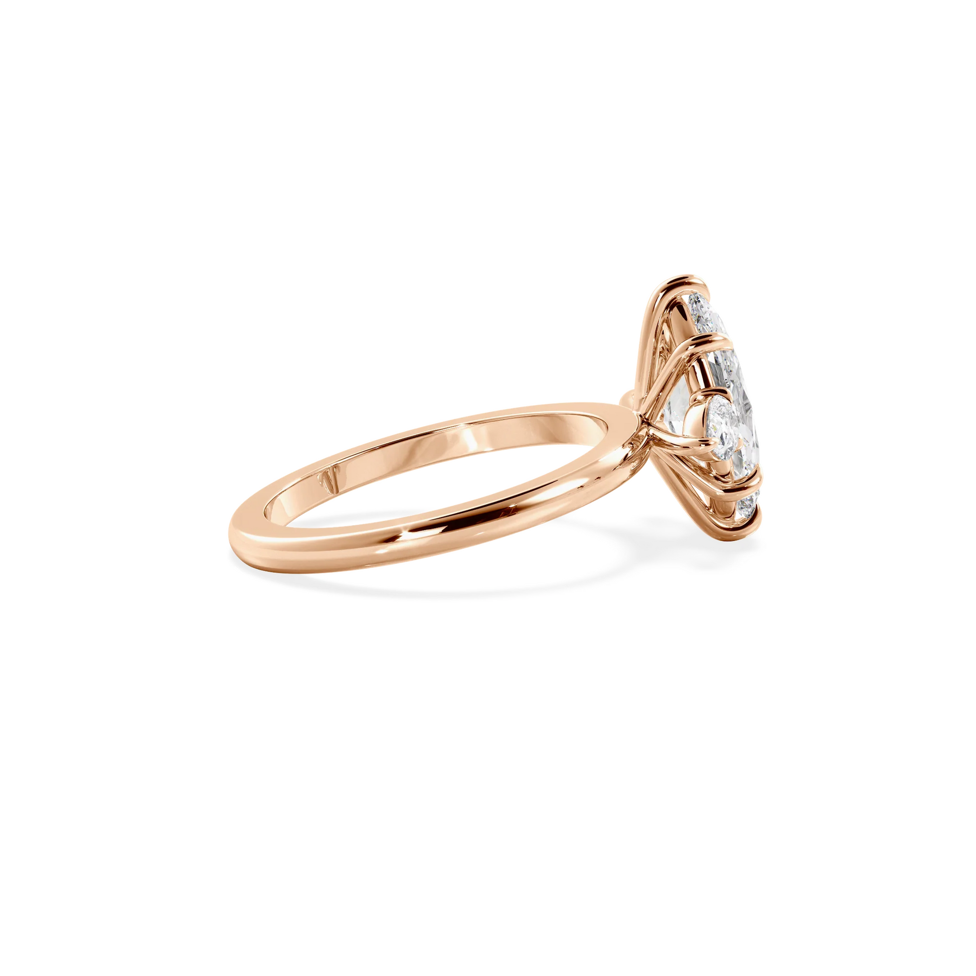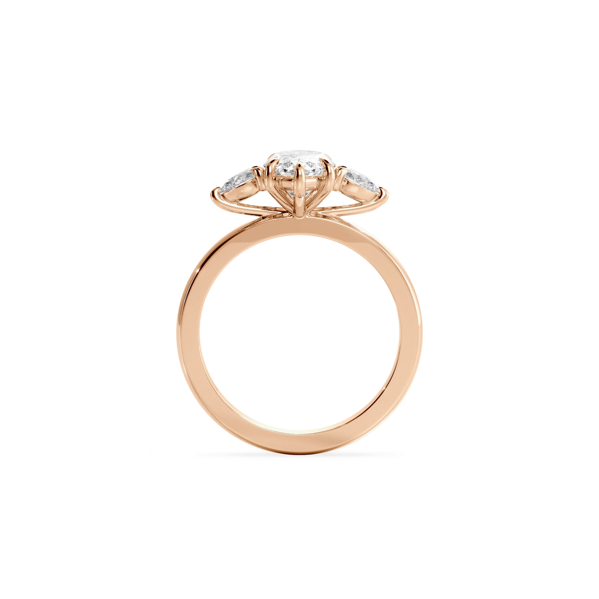 Oro rosado, con circonita AAA+ de 1ct . con dimensiones de 10X5mm. Un ancho de banda de 2 mm estilo media caña.